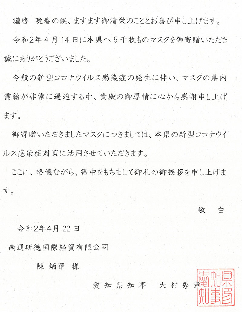 愛知県県庁と全国中華料理生活衛生同業組合連合会から感謝状授受